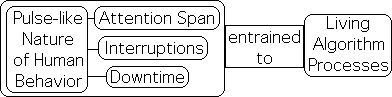 On the broadest level, the Attention/Math synergy seems to play a huge part in the ubiquitous pulse-like nature of human behavior. This pulse-like behavior permeates our existence – for instance our daily wake/sleep cycle and our attention span. In turn, our attention span determines the length of lectures, concerts, sporting events, and even conversations. Further, our pulse-like behavior tends to follow, i.e. entrain to, certain patterns that are reflected in the mathematical processes of the Living Algorithm. The most significant of these are: 1) the limited attention span, 2) the negative impact of interruptions, and 3) the necessity of down time to refresh attention.
