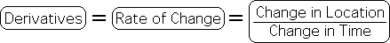 This process accords with our common sense notions of the first 2 derivatives, velocity and acceleration. Velocity is the 1st rate of change, the 1st derivative. Velocity is the measure of the change of location over time - how quickly we travel from one location to another. We compute this velocity/speed with a simple subtraction – final destination minus the starting point, also noting how long it took. Acceleration is the rate of change of this rate of change, the 2nd derivative. In other words, acceleration is a measure of how quickly velocity changes. We could also compute the acceleration with a simple subtraction - the ending velocity minus the initial velocity, also noting how long it took. For instance, when a car's velocity changes from standing (0 MPH) to 100 MPH in 10 seconds, it is said the car accelerates 100 MPH in 10 seconds.
