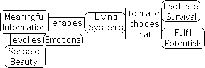 Information is inert without meaning. Meaning animates information – turning it into a form that is relevant to living systems. On the most basic level, Life might employ meaning to make choices that facilitate survival or fulfill potentials. On more subtle levels, meaningful information might evoke an emotion, a sense of beauty or excitement.