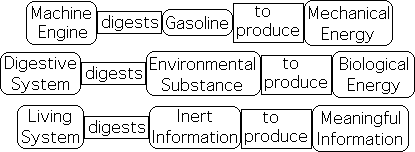 Living systems must have some type of mechanism to digest information. A stomach digests organic substances commonly called food. This process does not translate it into a new language. The digestion process transforms it into a new form, such as fat, proteins or carbohydrates. The Body then employs this digested food to run its biological systems. In similar fashion, we suggest that Life must have a method of digesting information. This information digestion process does not just translate binary bits into another language, but instead transforms it into a form that Life can invest with meaning.