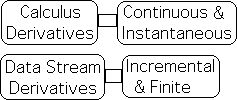 The derivatives of calculus are continuous and instantaneous, while data stream derivatives are incremental and finite. Let us see what the implications are.