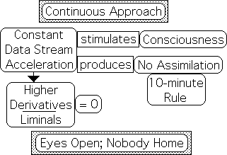 It might seem as if the data stream's acceleration is equally powerful, as it is associated with consciousness. Not so. Although the audience is conscious during the Continuous Approach, experimental evidence indicates that there is no comprehension or integration of the presented material. Why? The mathematical model makes an interesting suggestion in this regard.