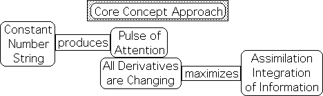 The derivatives of the Core Concept Approach simulate the advantages of this teaching technique. Instead of being constant, the acceleration of the Core Concept Approach proceeds in pulses. Prior papers have associated these pulses with pulses of attention, akin to the 10-minute attention span suggested by the 10-minute rule. Because the data stream's acceleration is constantly changing, the Liminals, the higher derivatives, are also continually changing. These highly active Liminals suggest that subconscious mental activity is equally active. Maximizing the potentials of unconscious cognition maximizes the assimilation and integration of information. Dr. Medina's many accolades as a teacher serve as evidence for the success of this approach.