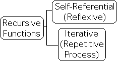 What does this mean? Recursive functions are both reflexive, i.e. self-referential, and iterative, i.e. the repetition of a set process.