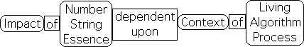 A highly significant feature of the Living Algorithm's digestion process concerns the dichotomy between Content vs. Context and the related topic of Essence vs. Process. The essence of the Number String remains the same throughout the process. However the impact of the essence is dramatically different depending upon the context. Let us provide some examples.