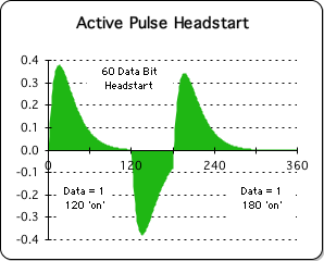 As mentioned, the 'refreshing' Number String must be of sufficient duration. When the middle Number String of 0's, deemed the Empty Number String, is shortened, this has a negative impact upon the ideal dimensions of the final Pulse (here called the Active Pulse). Following is a visualization of the data stream acceleration, when the middle Number String of 0's is shortened, i.e. the final Active Pulse gets a 'headstart'.
