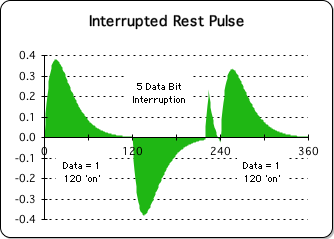 Strangely enough, 'interruptions' to the middle Number String of 0's also has a negative impact upon the ideal dimensions of the final Pulse. Following is a visualization of the data stream acceleration when the middle Number String of 0's (here called the Rest Pulse) is interrupted by 1's.