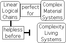 However complex and complexity are orders of magnitude apart in difficulty. Atomistic material systems are complex, while holistic living systems have complexity. Due in part to the multiplicity of their interactive relationships, holistic systems resist strict definitions. In these situations, Deduction sometimes, maybe even frequently, misses the mark. When wrong, the chain is completely broken. Linear logic is generally inept at analyzing the complexity of Living Systems.