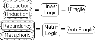 In the same way, it could be said that Matrix Logic (Metaphoric Systems and Redundancy Networks) is an emergent feature of Linear Logic (Deduction and Induction). Matrix Logic definitely has special unimaginable characteristics that can’t be derived from the constituent parts.  For instance, while Linear Logic is fragile, Matrix Logic is anti-fragile. The first can break from a little stress, while the second gets stronger from stress, within certain limits of course.