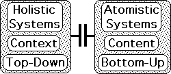 In contrast, inanimate material systems are atomistic. In this type of system, the parts determine the nature of the whole. The organization is bottom-up. Atomistic systems are content-based. They are best understood with reductionist thinking, breaking things into their smallest parts.