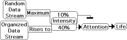 When a signal rises above 10% in intensity, it is highly probable that the signal is organized and needs to be attended to. In fact, the higher the data stream’s intensity, the less likely that it is random. If Attention’s filter threshold is set at 10%, this would allow the organism to differentiate a random from a sustained signal. When the intensity is above 10%, the signal has potential meaning. When it is below 10%, it is just noise. Attention could apply this threshold to determine which data streams to filter out and which to pass on to Life.