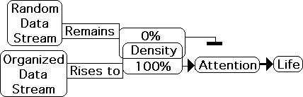 An organism's Attention could easily employ the first technique (Data Stream Intensity) as a detection device and the second (Data Stream Density) to confirm the assessment of the signal. When the data stream's intensity rises above 10%, the Attention passes the signal on to the organism. If the data stream's density is also rising, this is a further indication that the incoming information could be meaningful. In contrast, a random data stream's density does not rise consistently, but hovers instead around 0%. The two methods of differentiating a random from a meaningful signal could be employed as a form of cross checking. Living systems constantly employ this type of redundancy to affirm their notions of reality.