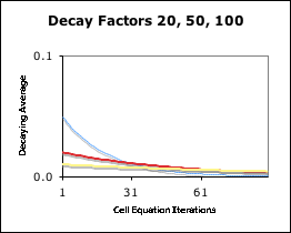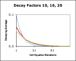 For comparison let's see what happens to the curve when the Decay Factor D is set at 10 and 20 - still in the stable range. This is illustrated in Graph B. The red line is identical to the curve in Graph A, (D = 16). The blue line visualizes the same process when D’s value is smaller (10). Notice how steep the descent of the blue line is in comparison to the red line. The blue line starts higher (.10 vs. .06) and ends more quickly (35 repetitions of the Living Algorithm process vs. 61). The smaller the Decay Factor is, the greater the impact of data on entry and the quicker it decays. Conversely the yellow line visualizes the same process with a greater D (20). Notice how flat the yellow line's descent is in comparison with the red line. The yellow line starts lower and ends more slowly. The greater the Decay Factor is, the smaller the impact of data on entry and the slower it decays.