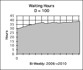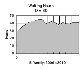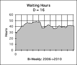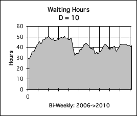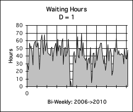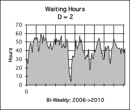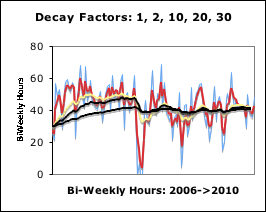 Our data stream consists of the number of hours the Author spent waiting tables. These values were tabulated on a bi-monthly level from 2006 through 2010 – every time he got a paycheck. We chose this data stream for a specific reason. The variety of Decay Factors from volatile to sedentary can show off their specialties with this particular data stream. During this period two of the restaurants where he worked closed their doors - one due to the Recession of 2008-9. Plus he went through a physical/psychic breakdown at the beginning of 2008, which caused him to miss an abundance of work. Due to these factors, the data stream has moments of regularity mixed in with periods of abrupt starts and stops. Let's see how our Decay Factors reflect this turbulence.