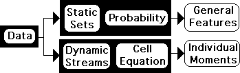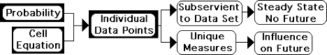 The central measures (averages) that Probability employs to characterize each data set are permanent – never changing. In contrast the Living Algorithm never characterizes entire data streams, only individual moments in the stream. Further the measures (the predictive cloud) that the Living Algorithm employs to characterize each moment in the data stream are unique to that moment. They cannot be applied to the data stream in its entirety. In relation to one another, they are in a constant state of flux - adjusting appropriately to each new data point. Probability’s averages apply to the entire set, while the Living Algorithm’s predictive cloud only applies to individual moments.
