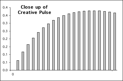 A close-up of the Living Algorithm’s Triple Pulse is visualized in the graph at the right. The image illustrates how she is made up of distinct, rather than continuous parts. The apparent continuity in her classic representation is just an illusion. The illusion of continuity is due to the large number of iterations (repetitions). In similar fashion, the characters in movies and cartoons appear to move continuously, but are instead based upon distinct frames that are shown rapidly enough that our visual processor turns them into a moving picture. In the case of the Triple Pulse, the bars create a similar effect to the cartoon frames. When there are enough of them, they give the image of the Triple Pulse a continuous appearance.