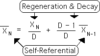In mathematical terms, the Present is a function of both the Past Average and the new Data. The Living Algorithm combines ongoing Raw Data with the Past Average to create the Present Average. Accordingly, this computation must be performed each time there is another input of data. This referencing of the past to generate the present is what makes the equation self-referential. The fact that new Raw Data is continually refreshing the system is what makes the equation regenerative.