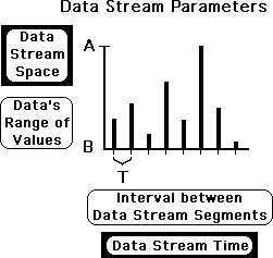 The parameters of the data stream determine the limits of data stream space and time. In the graph at the right, we picture a raw data stream. The vertical y-axis determines the location of the data in data stream space, and the horizontal x-axis determines data stream time. Let's see how.