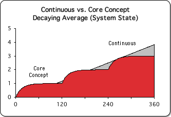 However, a nagging mathematical fact remained. The Living Average of the mathematical model for the Continuous Approach rises to 4 mathematical units. By comparison, the Living Average of the Core Concept model rises to 3. (See graph.) In fact, it is visually apparent that the Continuous Approach moves increasingly ahead with each step of the Core Concept. If we take the Living Average (the state of its system) to indicate how much information is transmitted, then these results seems to indicate that the Continuous Approach is able to impart more information (33% in this case) than the Core Concept Approach. What is the significance of this finding? If the Core-Concept Approach were truly a more effective teaching method, then it would seem that the state of its system would end higher. Does this indicate that the Continuous Approach might be more successful than the Core-Concept Approach at transmitting a bulk of information, at least in certain circumstances? Answering this question is the thrust of this article.