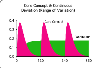The graph at right compares the Deviations of the Continuous and Core-Concept Approaches to presentations. The Deviation of the Continuous Approach (the green background sector) rises to about 0.2 and then remains there for the duration. In contrast, the Deviation of the Core-Concept approach (the three magenta pulses) rises twice as high (to about 0.4) and then falls to 0 in each pulse.