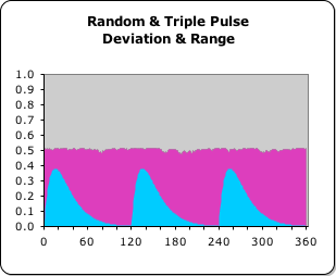 At right is a visualization of the Deviations of each data stream as compared with their common Range (1.0). The blue curved area is the Deviation of the Triple Pulse. Notice how it rises and falls with each pulse. The ragged purple area is the Deviation of a Random data stream. Note that the Triple Pulse peaks (≈.35) are significantly smaller (≈30%) than the relatively flat line (≈.50) of the Random Stream's Deviation.