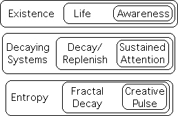 Below is a diagram showing the interlocking nature of these decaying systems. Outer Layer: Due to entropy all of existence continually decays. Middle Layer: Life has the unique ability to replenish this continuous decay – sex for reproduction to replace the dying members of the species – food to replenish depleted nutrients – and water to replace the waste. This is the complete realm of fractal decay. Inner Layer: Awareness has the ability to sustain attention. This generates a pulse, creative or destructive – which is a subset of the mathematics of fractal regeneration.