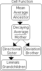 The Living Algorithm, a.k.a. the Cell Function, digests any data stream. The digestive process produces the rates of change (the derivatives) that describe the data stream's ongoing moments. To facilitate understanding we characterize these data stream derivatives as a family of ongoing averages (central measures). The traditional mean average is the ancestor (the Living Algorithm without decay). The data stream's 1st derivative, i.e. the Decaying Average, is the mother. In this role, she gives birth to 2 children, a son and a daughter. These are the data stream's 2nd derivatives. The brother in the family is the Deviation, a sheer magnitude without direction. The sister is the Directional, a directed magnitude. The Directional, in turn, gives birth to the Liminals, the grandchildren of the family. These are the data stream's higher derivatives. Their relationships are shown at right. Check out the article Living Algorithm Family for more information.