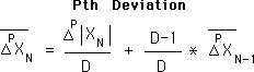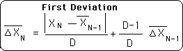 The equation is shown at right. It utilizes the Xs with subscripts (XN) and bars () to identify the Decaying Average. Subscripts indicate the Decaying Average's place in the data stream and the bar indicates that it is an average rather than an individual data point.