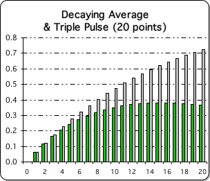 We can also view the Living Average in terms of its vertical components – moment-to-moment. In the graph at left we take a column view of both the Living Average and the Directional – the Living Algorithm's 1st and 2nd derivatives. Remember this is the result when the Living Algorithm digests a data stream consisting solely of ones, 20 to them to be specific. Accordingly, this graph is a snapshot of the first 20 data points of the Living Average and the Triple Pulse's Active Pulse, a.k.a. the Pulse of Attention, from a purely vertical perspective.