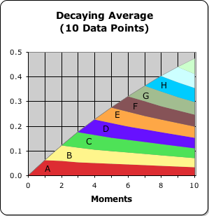 Each color rectangle can be characterized by a specific moment (in this case 0 through 20) and a specific data bit (also 0 through 20). For instance, the large blue rectangle at the bottom left of the graph represents the contribution of the 1st data bit to the Living Average at the 1st moment in time, while the yellow-orange rectangle at the upper right represents the contribution of the 20th data bit at the 20th moment in time. Each rectangle has a specific location in our graph.