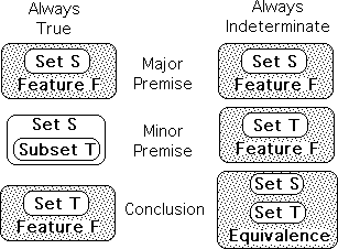 Although the process-based syllogism is different in crucial ways from the classic syllogism of traditional object-based science, the syllogistic reasoning behind process sets is true all the time. There is no necessity for experimental verification. If someone, anyone, is involved in the process of riding a bike, they are also involved in balancing – an inherent feature of bicycling. Anyone that participates in the process of sustenance also participates in ingestion, digestion, and elimination – essential features of the process. The syllogistic reasoning applies to both process-based and object-based systems. The statements are true in all times and places. The primary differences between process sets and object sets – have to do with the differences between processes and objects. The deductive syllogism, which holds true for both object and process sets, holds that Particular Members T of Set S will have the same general features as Set S. Similar, but fallacious, is the Correspondence syllogism, which assumes set equivalence due to feature equivalence. This is indeterminate. This relation is shown in the following chart.