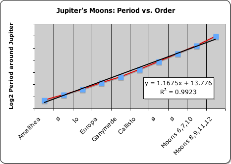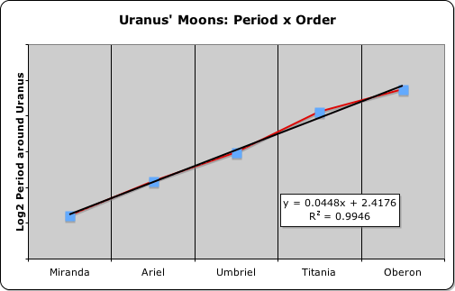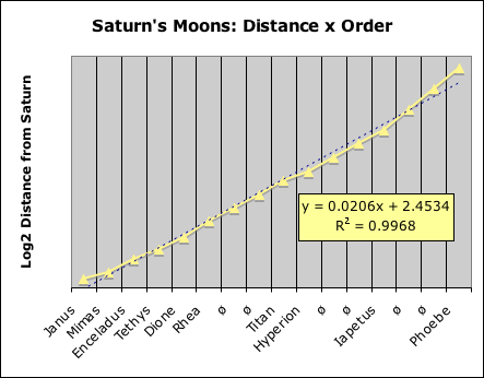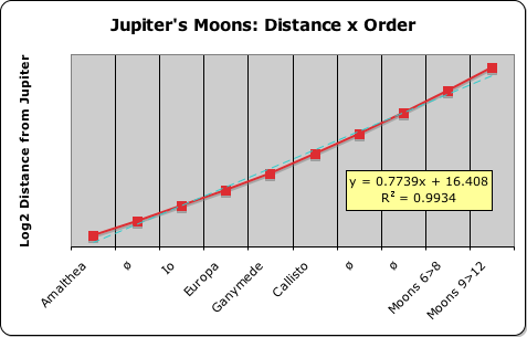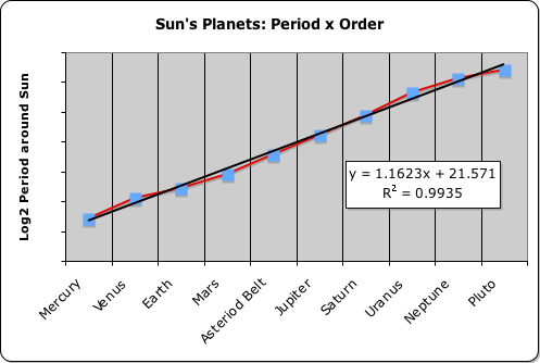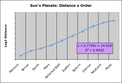 How strong is this relationship? What is the correlation between planetary position and distance from the Sun? The purple box on the graph contains this information. On top is the equation for the best-fit line; on the bottom is R2, i.e. the linear correlation between solar distance and order. The correlation between the 2 parameters is 99.39% – high by any standards.