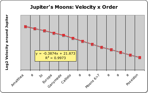 In graphing Jupiter’s Moons: Period x Order, we inserted 3 phantom planets (ø) just like before. We then clumped Moons 6 & 7 for having similar periods, as before. This is where the similarity ends. Moon 8 is grouped with the outer moons, unlike before when it was grouped with Moons 6 and 7. More mysteriously, Moon 10 is totally out of order, as its period is shorter than Moons 8 and 9. We included it with the 6-7 clumping, as each of these 3 moons had similar orbital periods. Further we also grouped Moons 8, 9, 11 and 12 together as they also had similar periods. We justified this unusual organization because these outer moons are all moving in the opposite direction (retrograde) from the rest of Jupiter’s moons. (More on Jupiter’s unusual gravitational system when we examine orbital velocity.)