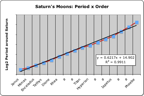 We followed the same format as with the distance and periods: the Sun (1 phantom planet), Saturn (6 phantom planets) and Uranus (0 phantom planets). This time we completely excluded Jupiter’s last 4 moons from consideration. This position is somewhat justified in that Jupiter is now thought to have over 100 moons, not just the 12 we have included in our graphs. The Galilean moons, the ones Galileo viewed through his ordinary telescope, comprise over 99% of the lunar mass. The orbits of these major moons and some of the others are distinctly quantized, as our graphs illustrate.
