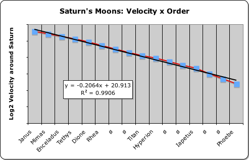 Before proceeding forth to examine the orbit’s period and velocity, let us expose some anomalies. The horizontal axis of the graphs that visualize the distances of the moons from both Jupiter and Saturn require some explanation. Both contain the symbol ‘ø’ in some of slots rather than the name of moon, e.g. Titan. This symbol indicates an orbit that does not contain any evidence of a moon. What is our justification for this insertion? Our solar system contains a similar insertion.