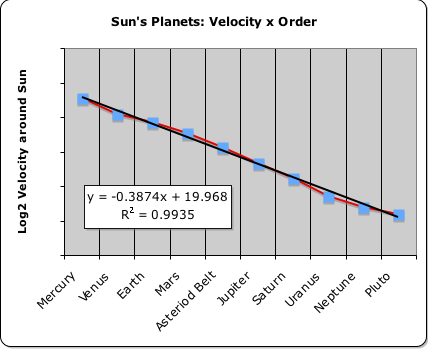 We’ve seen that both orbital distances and orbital periods are quantized. What about orbital velocities? Dividing distance by period produces the velocity. Just because orbital distances and periods are quantized, it does not necessarily follow that orbital velocities are also quantized. But they are, as the following graphs illustrate. Again the correlations between order and velocity are quite high: all over 98.5%.