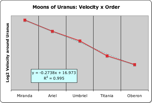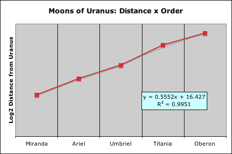 Although not necessarily applicable to other solar systems, this logarithmic rule certainly applies to the moons of Jupiter, Saturn and Uranus, as the following graphs illustrate. Notice that the best-fit line in each of the cases is nearly identical to the line connecting the Lunar Dots. Indeed the lowest of the 3 correlations between order and distance is 99.5%. Not too shabby! This level of correlation definitely meets the stringent standards of the Material Realm.