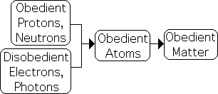 Connecting the dots: The interaction of obedient subatomic particles and disobedient subatomic entities yields obedient atoms, which are the building blocks of obedient matter. In other words, the obedient world of matter has at its foundation disobedient subatomic entities.