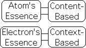 The situation is reversed in our atom-based world. Atoms, the ultimate particle, are pure content. Context has nothing to do with the essence of an atom. As mentioned, atoms are one of the most permanent essences in the universe. They have no life span and, under normal circumstances, could easily last billions of years. Their absolute content is the delight and security of material scientists. The assumption is that hydrogen atoms everywhere in all times and places are identical in content and behavior. Atoms are the ultimate well-behaved particle. Their behavior is perfectly predictable over eternity. While an atom is pure content, an electron’s essence in based in context. In this sense, electrons and atoms are opposites, not belonging in the same category box at all.