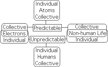 Let's summarize our findings. The behavior of individual atoms is totally predictable. In contrast, the behavior of individual photons and electrons is totally unpredictable. Similarly the behavior of living systems is also unpredictable on individual levels. While unpredictable on individual levels, the behavior of both the disobedient subatomics and non-human life is predictable on the collective level. Because human social structure evolves, even our general behavior is unpredictable. Thus the behavior of atoms diverges significantly from the behavior of photons, electrons, and life. Individual atoms are predictable, while the individual behavior of subatomic entities and living systems is unpredictable.