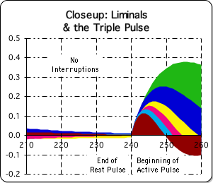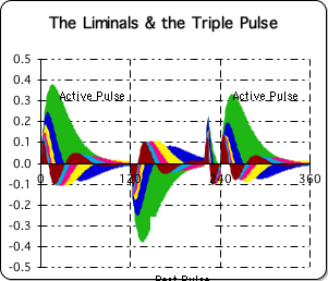 Although both the Pulses and the Liminals approach zero together in the ideal circumstance, the agenda of each of the Liminals is independent of the entire pulse. On observation it is clearly evident that each of the Liminals consists of a variety of mini-pulses that have two features. First, these mini-pulses rise above and descend below the centerline in a regular pattern. And second, they gradually decrease in magnitude over the span of the pulse. This is entirely different from the defining green curve, which is either above or below the centerline (the x-axis) during the entire pulse.