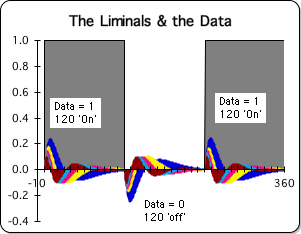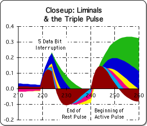 These interruptions also have another interesting effect. The turbulence of the interrupted Liminals prevents the ensuing Active Pulse from realizing 'his potentials' (maximum dimensions). Why? The disturbance of the Liminals bleeds into the beginning of following pulse. The turbulence interferes with and disrupts the rhythm of the pulse. To maximize potentials, both the Active Pulse and the Liminals must start at 0. This insures that all data stream derivatives move in the same direction once the string of 1s that generates the Active Pulse is initiated. If even one of the Liminals is moving in a contrary direction, this inhibits the Active Pulse from accumulating forward momentum. In general, we can say that interruptions in any given pulse prevent the derivatives of that pulse from zeroing out. And the failure of the pulse to zero out disrupts the rhythm of the following pulse.