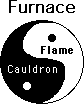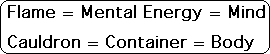 The Cauldron is the container that holds our Life. As such, it is associated with our Body, our material component. In Chinese five-phase theory, the Cauldron is Earth. The Flame is Life's energy or vitality. It is associated with Mind. In Chinese five-phase theory, the Flame is Fire. We apply mental energy to our body to fulfill our potentials. The Flame is applied to the Cauldron to cast the metal.