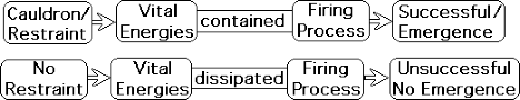 The Cauldron is an essential component of the Firing Process. If the Cauldron cracks or is missing, the Soup spills on the ground and the energy of the Flame is dissipated. Accordingly, the Cauldron represents restraint in the process of self-actualization. Without restraint the vital energies are dissipated needlessly and pointlessly. Wasting the vital energies jeopardizes the Firing Process. If the Firing is unsuccessful, the magical features of Emergence are lost. With restraint the vital energies are contained, concentrated, and conserved. The Flame burns long and hot enough to successfully complete the Firing Process. Emergence occurs. We transcend our Fate and realize our Destiny. Instead of being victimized by life's circumstances, we achieve Self-actualization.