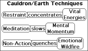 The Cauldron is associated with Earth in the 5-phase theory. As such, remaining still is an important technique associated with the Cauldron. Remaining still has many applications. Meditation stills the Mind of its cultural momentum. This process slows our inadvertent motion that can lead to destructive consequences. This slowing process provides time for self-reflection. Self-reflection provides an opportunity to choose when to participate when to abstain. A Mind that is racing with thoughts has no time to make relevant choices.