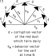 While illustrating the state of continuous corruption, the d vector is shown pushing the s vector from facing right to facing left. The Direct Perception of Reality has been completely corrupted by the Red Dust of cultural conditioning which falls daily. This is why the World Dream corrupts all of us, but the idealized saint. This is why it takes effort to remain clean. Constant scrubbing is necessary to avoid the pollution.