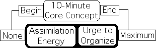 Let's apply our analysis first to the 10-minute rule and then to Medina’s core concept approach. At the beginning of the presentation of a core concept, the residual energy associated with assimilation is non-existent. This assimilation energy grows during the 10-minute presentation. Perhaps this growing assimilation energy triggers a complementary urge to organize the accumulated information. Mind has taken in enough material on that particular topic and needs time to organize it. Put another way, the growing urge to assimilate competes with and then overwhelms the fading urge to accumulate. Mind can’t invest any more mental energy in this core concept and begins to fade.