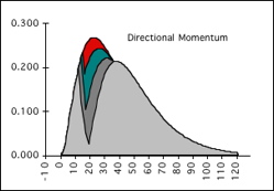 The following graph provides a visualization of the Directional Momentum (the acceleration) of data streams consisting solely of 1s (Attention) and 0s (Interruptions). The ideal Pulse (all 1s) looms high above in the background, while Interrupted Pulses (containing some 0s) are shown in the foreground.