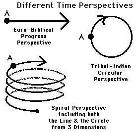 First comes linear time. Time is a line. Then comes the idea that many phenomena repeat themselves regularly over time. Time becomes a circle. Third comes the idea of Progress. We are moving forward through our Time Line. The concept of Progress initially looked down upon the Time Cycle. Our Western culture tends to emphasize the moving ahead and deemphasizes the cycles. But the cycles are there so the inevitable merger of Time Lines and Time Circles leads to the Time Spiral. Technologically superior cultures tend to focus upon Time as a forward moving line, while unchanging cultures tend to focus upon Time as a circle.