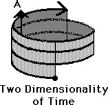 Because Ecological Time has a vertical and horizontal component, Time becomes two-dimensional. See Diagram below. Remember that this is not a static cylinder. It is a growing spiral, moving ever upwards within its repeating cycles. If someone pulled on the line, it would turn into one line not many.